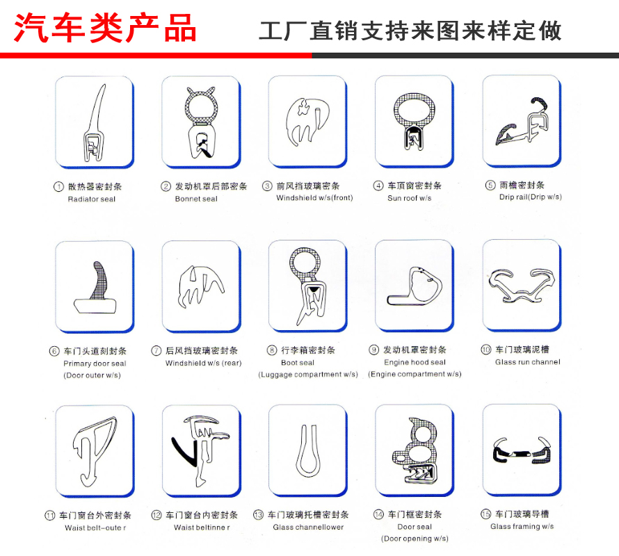 側(cè)窗密封條(side windowsealing),天窗密封條(sunroof sealing),車門(mén)頭道密封條(primary door seal),窗導(dǎo)槽密封條(glassrun channel),